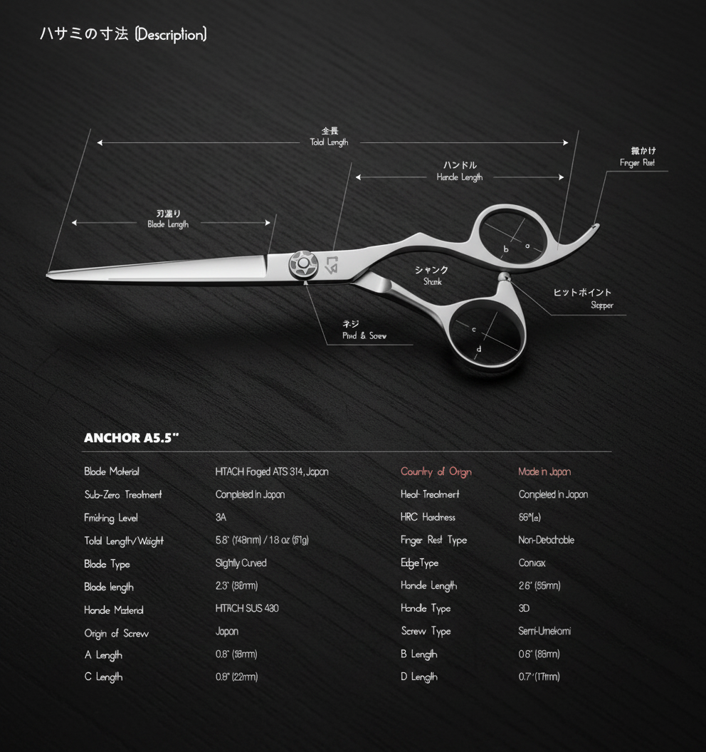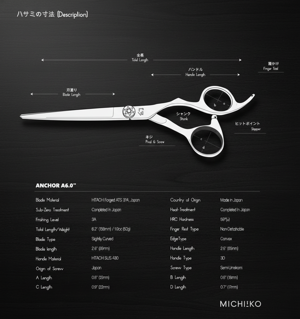 The ANCHOR A is an ergonomically designed cutting scissor. Japanese forged ATS314 blade with MICHIKO's original 3D design handle allows the best all-around cutting techniques on wet and dry hair and provides more comfort and control but less tiredness while cutting.
