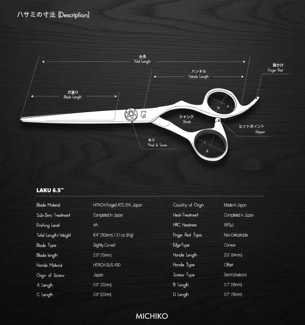 The LAKU is a premium cutting scissor with MICHIKO's original design handle. Japanese forged ATS314 blade allows the best all-around cutting techniques on wet and dry hair. The slightly bent thumb ring fits most hands with comfort.