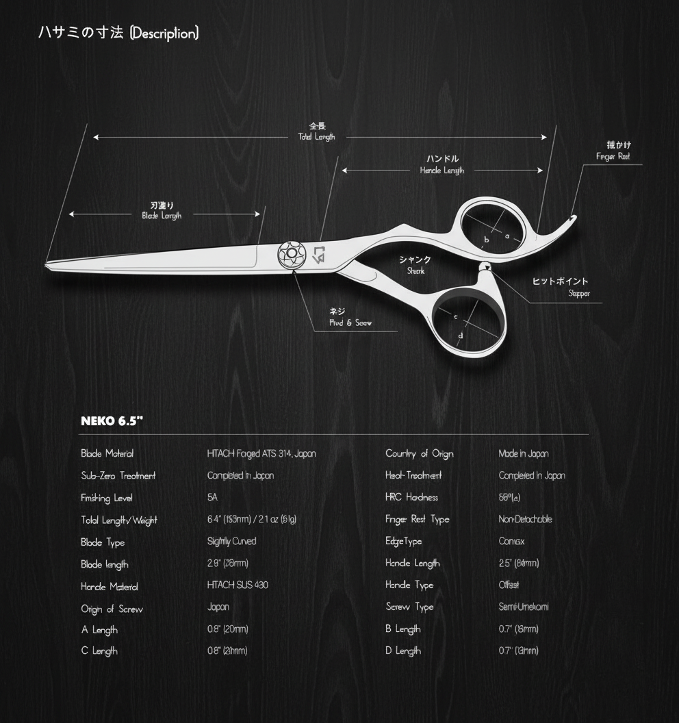 The NEKO is a premium cutting scissor with MICHIKO's original design handle. Japanese forged ATS314 blade allows the best all-around cutting techniques on wet and dry hair. The slightly bent thumb ring fits most hands with comfort.