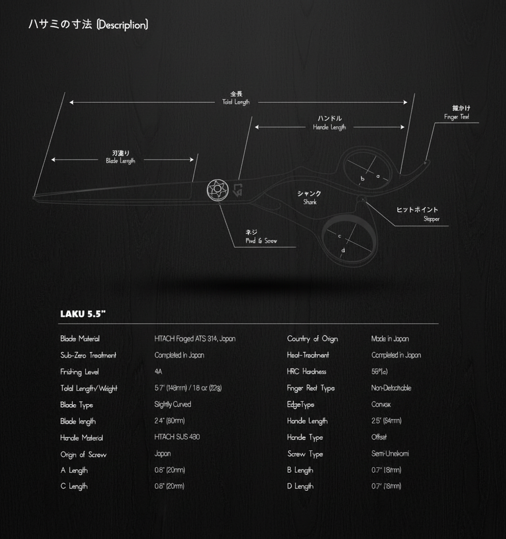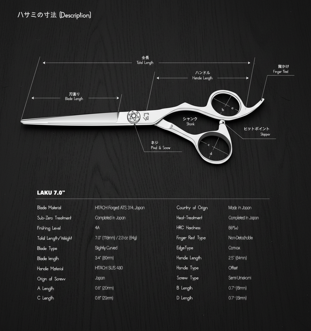 The LAKU is a premium cutting scissor with MICHIKO's original design handle. Its Japanese-forged ATS314 blade provides the best all-around cutting techniques on wet and dry hair. The slightly bent thumb ring comfortably fits most hands.