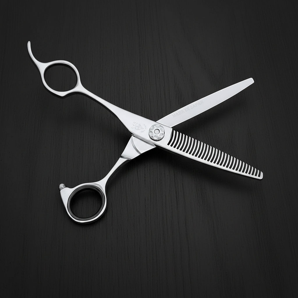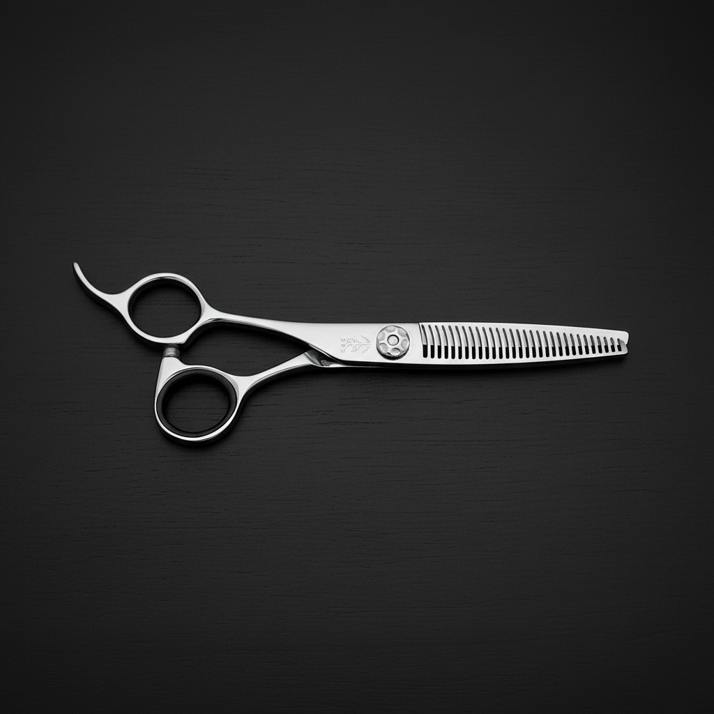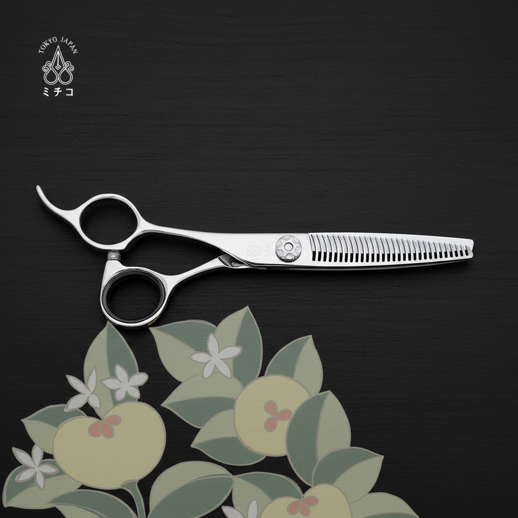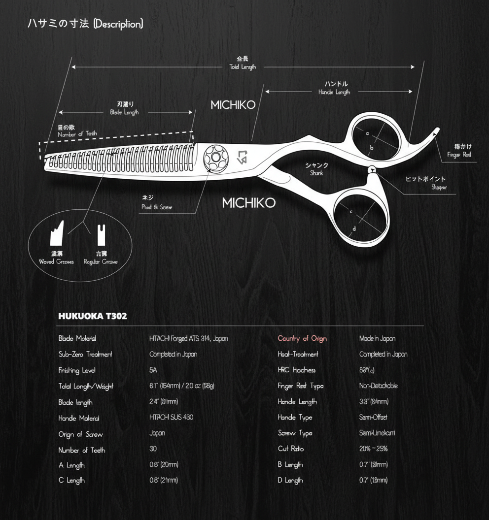 The HUKUOKA T302 is a 6-inch 30 curved teeth that remove about 20%~25% of hair. Two waved grooves on each tooth left no cutting lines. A classic offset handle naturally fits most hands.