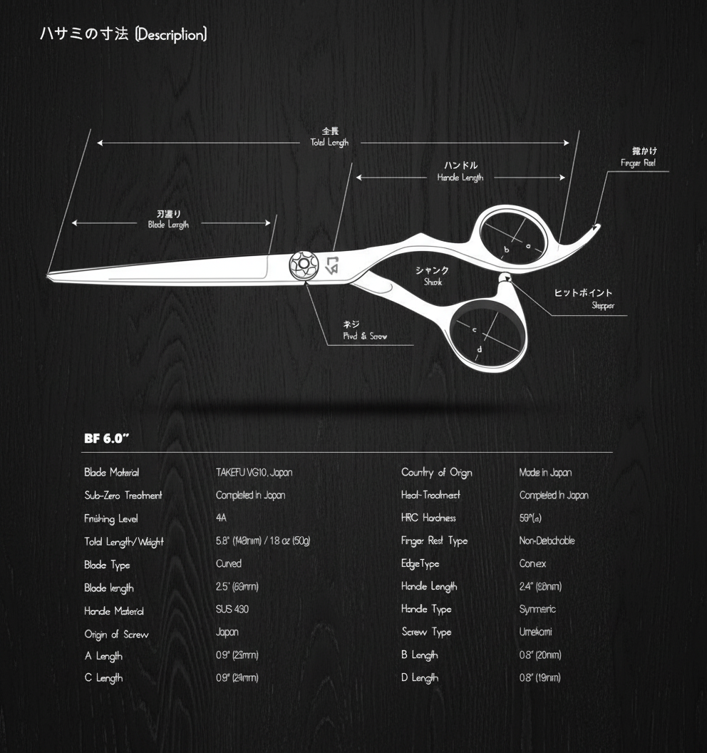 The BF 6.0" is a wide leaf-shaped blade of scissors with the original MICHIKO symmetric handle. The more curved cutting edge performs a smooth slide cut. The symmetric handle provides a wide range of hand motions vertically and horizontally, helping create various cutting techniques.