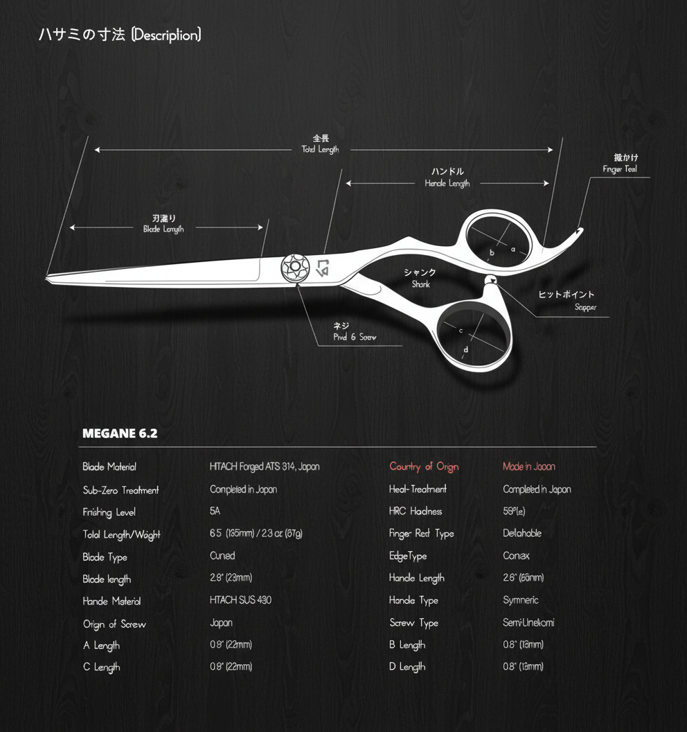 The MEGANE 6.2 is one of the best dry slide-cutting scissors. 6.2" in length, and the wide leaf-shaped blades with a more curved cutting edge perform the best slide cut ever. The symmetric handle provides a wide range of hand motions vertically and horizontally, which helps create various cutting techniques. The thumb side handle is more extended, so the cutting power is up by the principle of leverage. Big enough thumb and finger rings with two detachable finger rest comfortably fit most designers' hand. The handle is symmetric, but it is not ambidextrous.