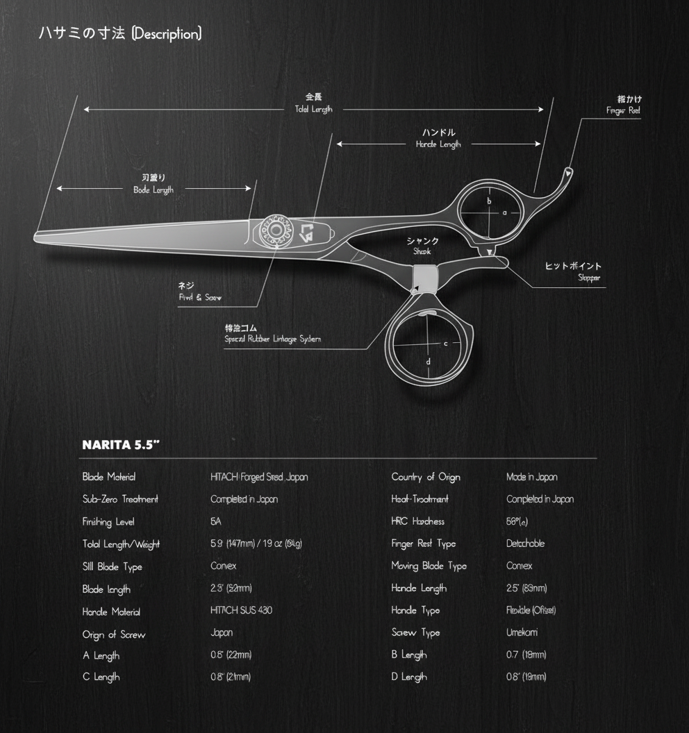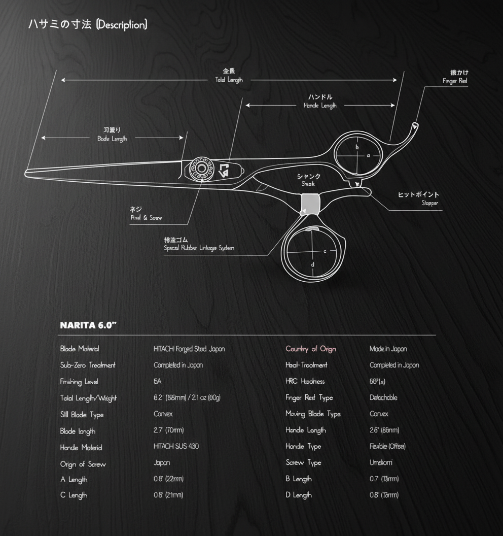 The NARITA is a blunt-cutting scissor from the Painkiller series. Painkiller shears' flexible thumb ring saves cutting time by holding the comb and shears together without pulling your thumb out between cuts.