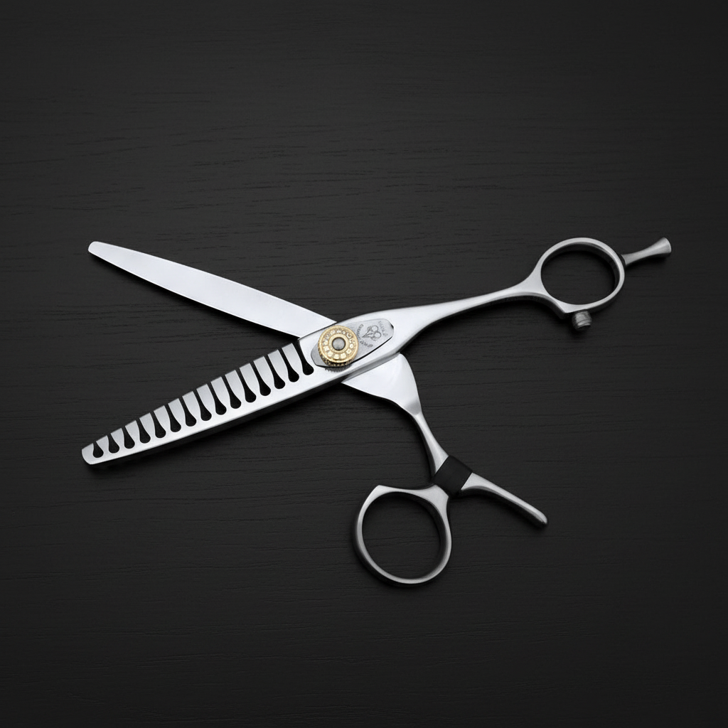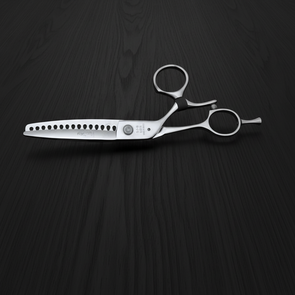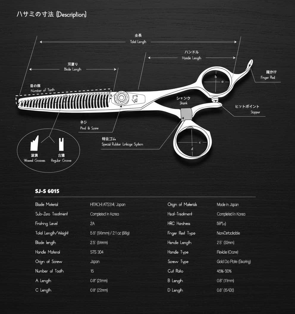 The SJ-S 6015 is a regular line thinning scissors from the Painkiller series. A crane-type handle fits the hand comfortably and lowers the shoulder and elbow while cutting for less tiredness. 6 inches long with 15 teeth and removes 60% ~ 65% of hair. Painkiller shears' flexible thumb ring saves cutting time by holding the comb and shears together without pulling your thumb out between cuts.