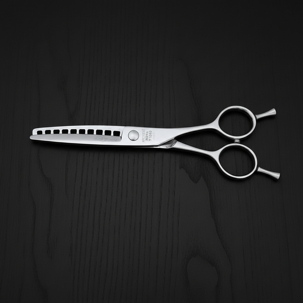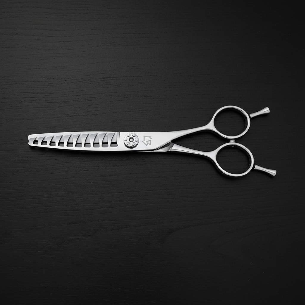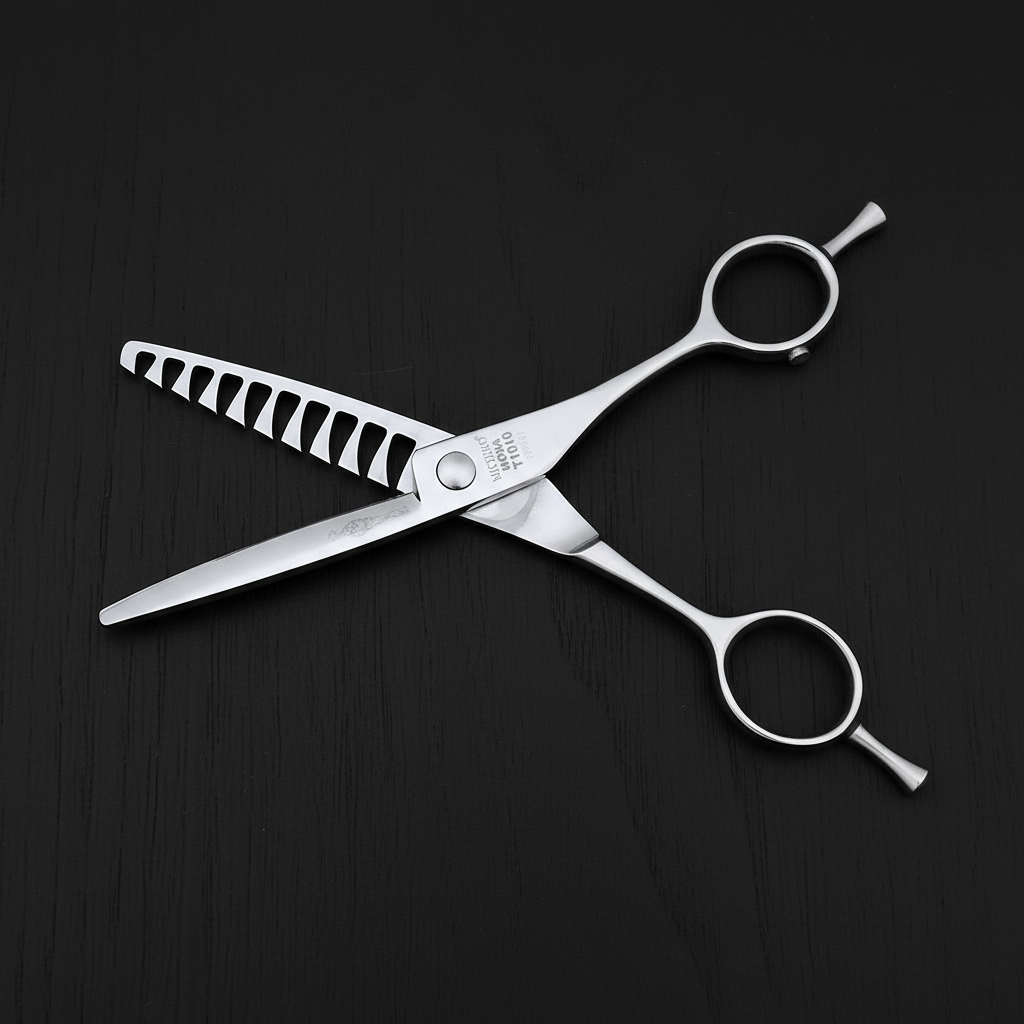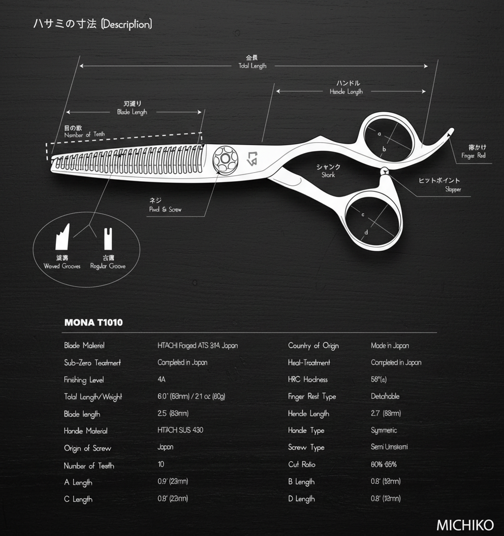 The MONA T1010 is a 6-inch 10-teeth texturizer that removes 60%~65% of hair. Each tooth has 10 waved grooves which help blend hair after each cut. The symmetric handle provides a wide range of hand motions vertically and horizontally, which helps create various cutting techniques, including flipping to use the reverse direction.
