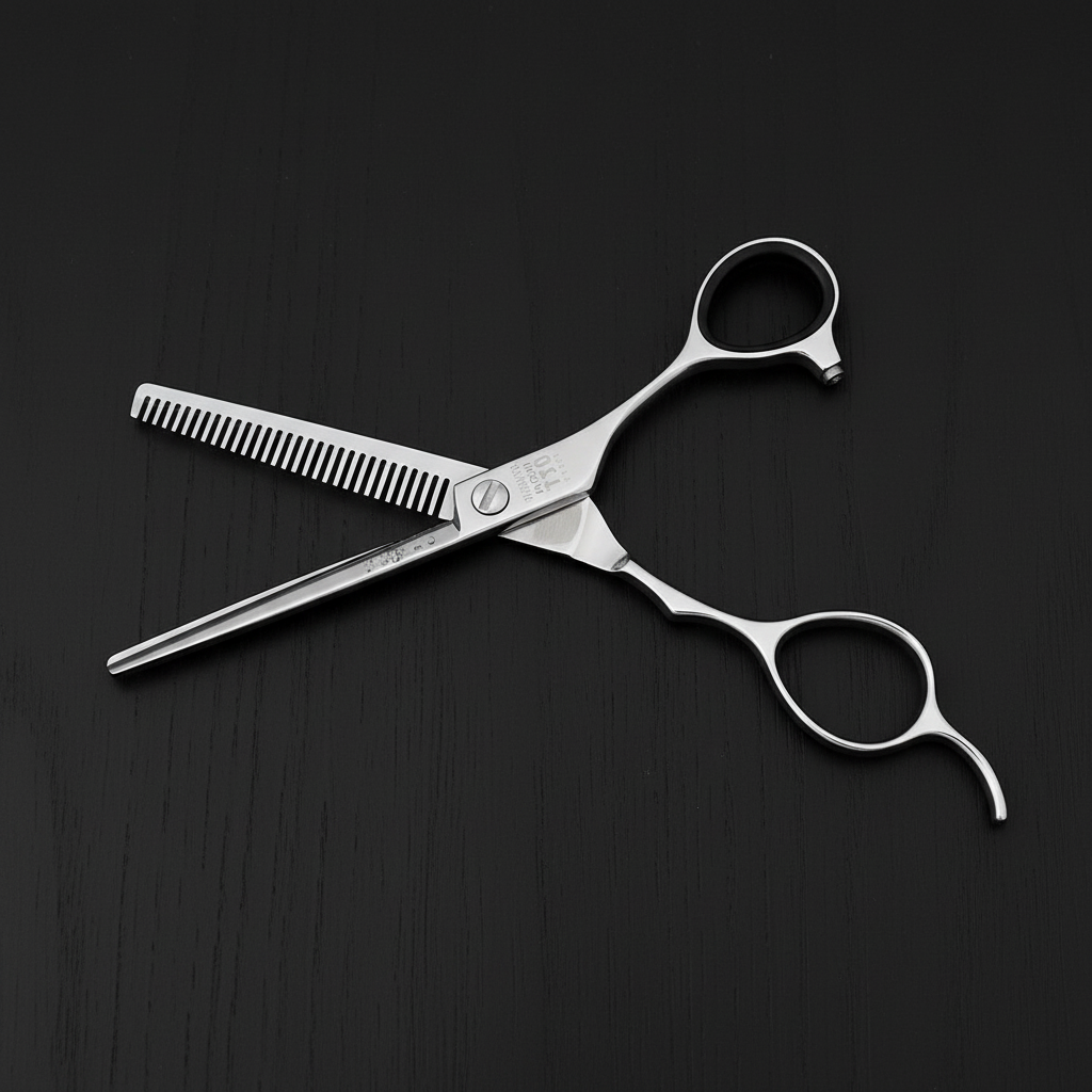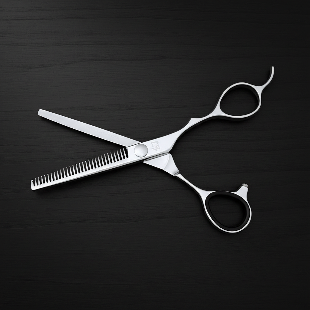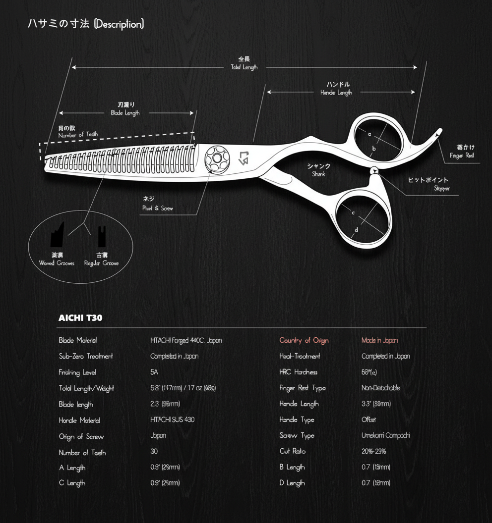 The AICHI T30 is a 5.8-inch 30-teeth thinner that removes 20%~25% of hair. A 'V' shaped groove on each tooth helps with easy hair removal. Oval-shaped finger and thumb rings on the offset handle comfortably fit most of the hand.