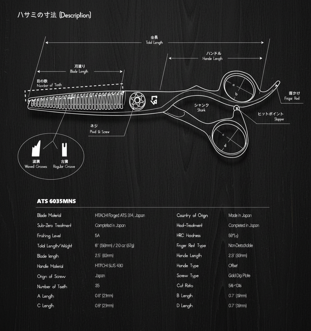 The ATS 6035 MNS is a 6-inch 35-teeth thinner that removes 5%~10% of hair. A classic offset handle naturally fits most hands.