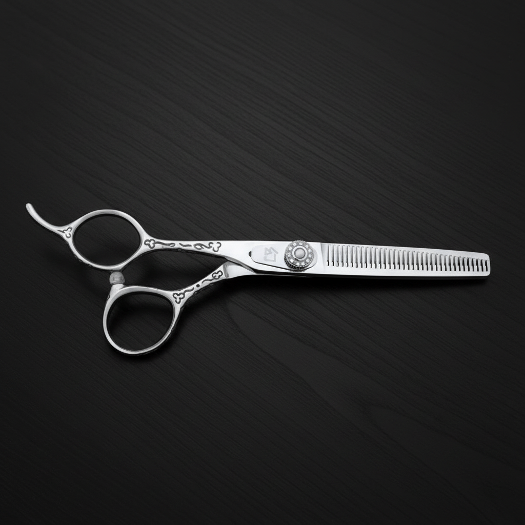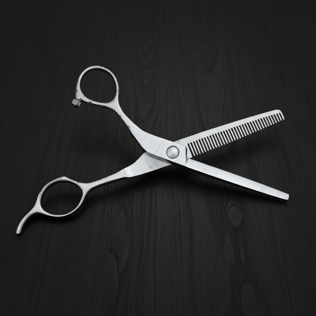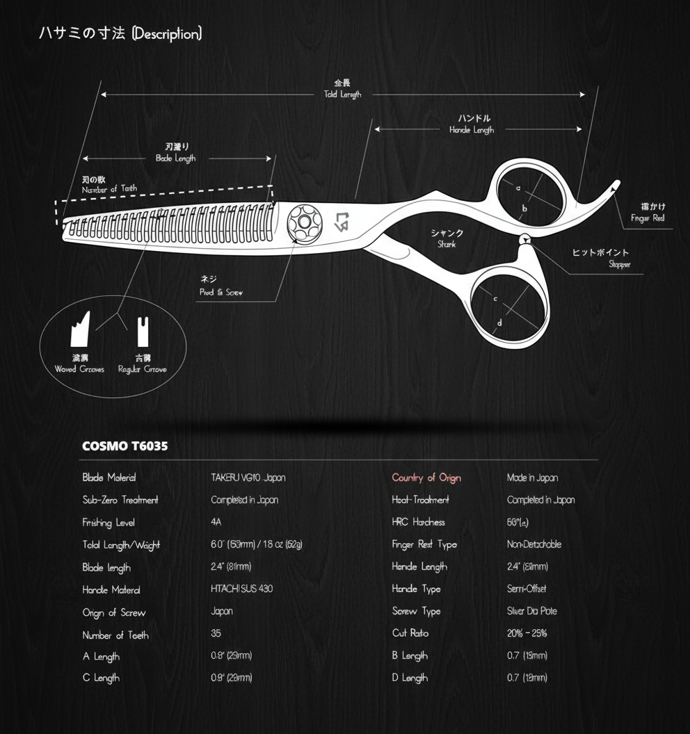 The COSMO T6035 is a 6-inch 35-teeth thinner that removes 20%~25% of hair. lightweight with a unique carved offset handle.
