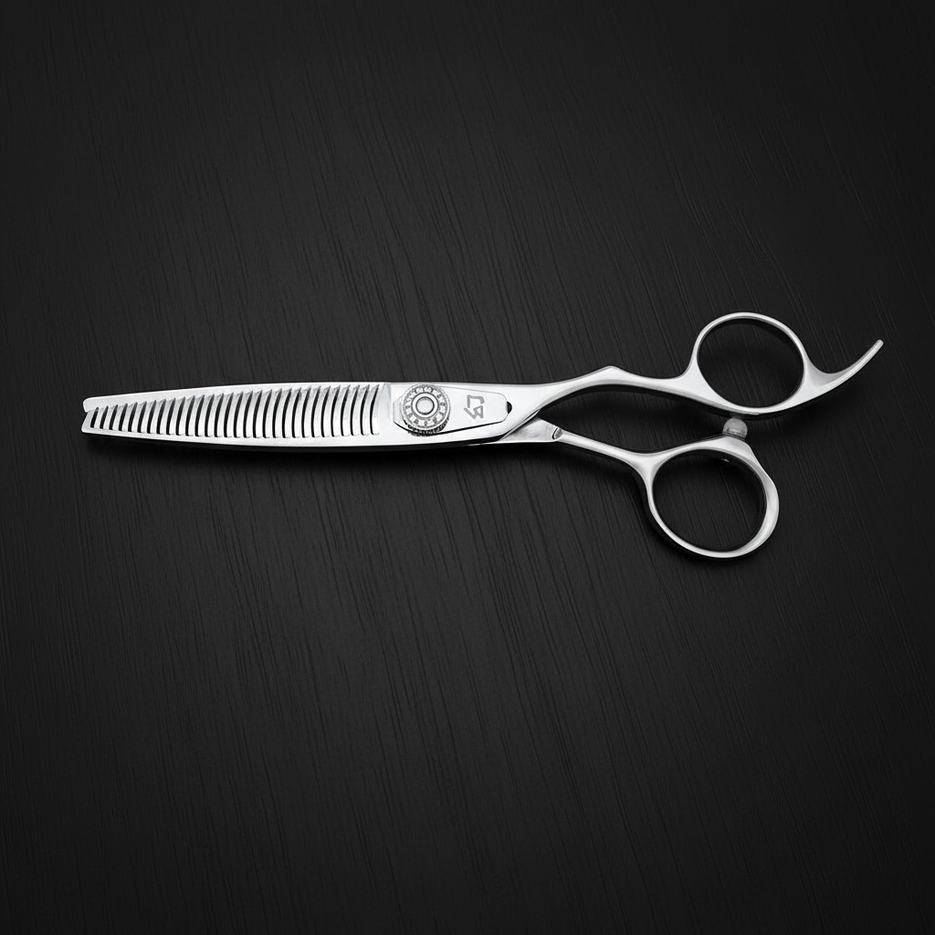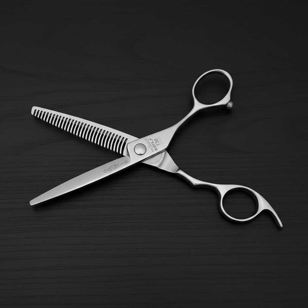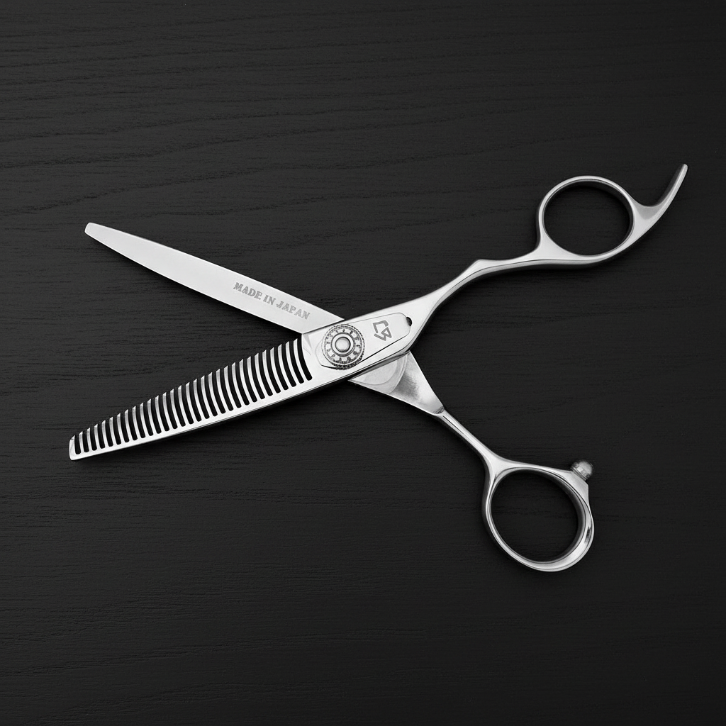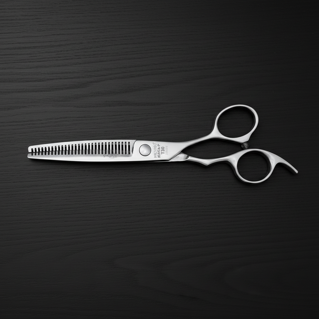 The KATA-P T302 has a lightweight design that allows stylists to perform with ease. Its 6-inch 30-tooth thinner removes 20% to 25% of hair, and two waved grooves on each tooth leave no cutting lines. An offset handle with a bent thumb ring will naturally fit most hands.