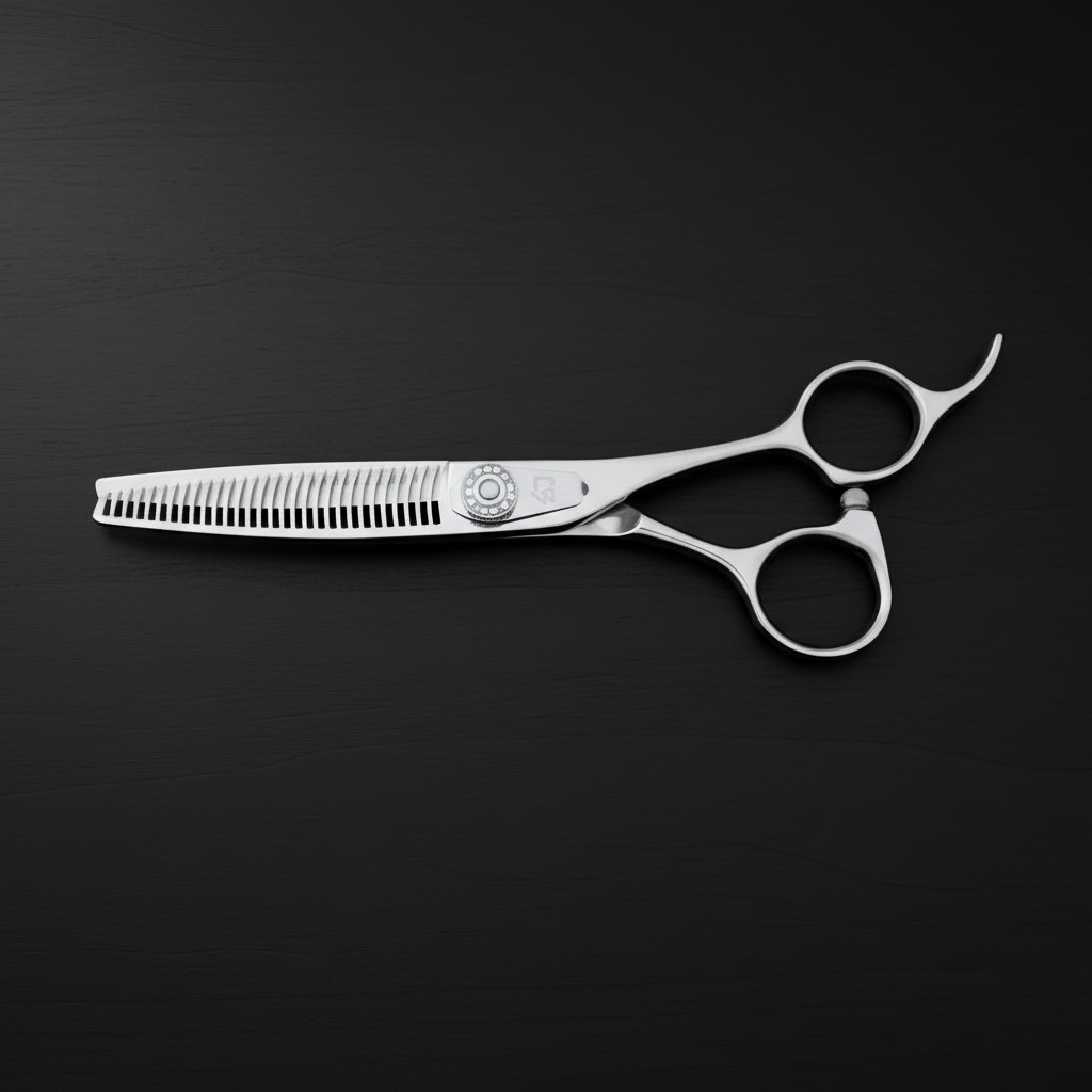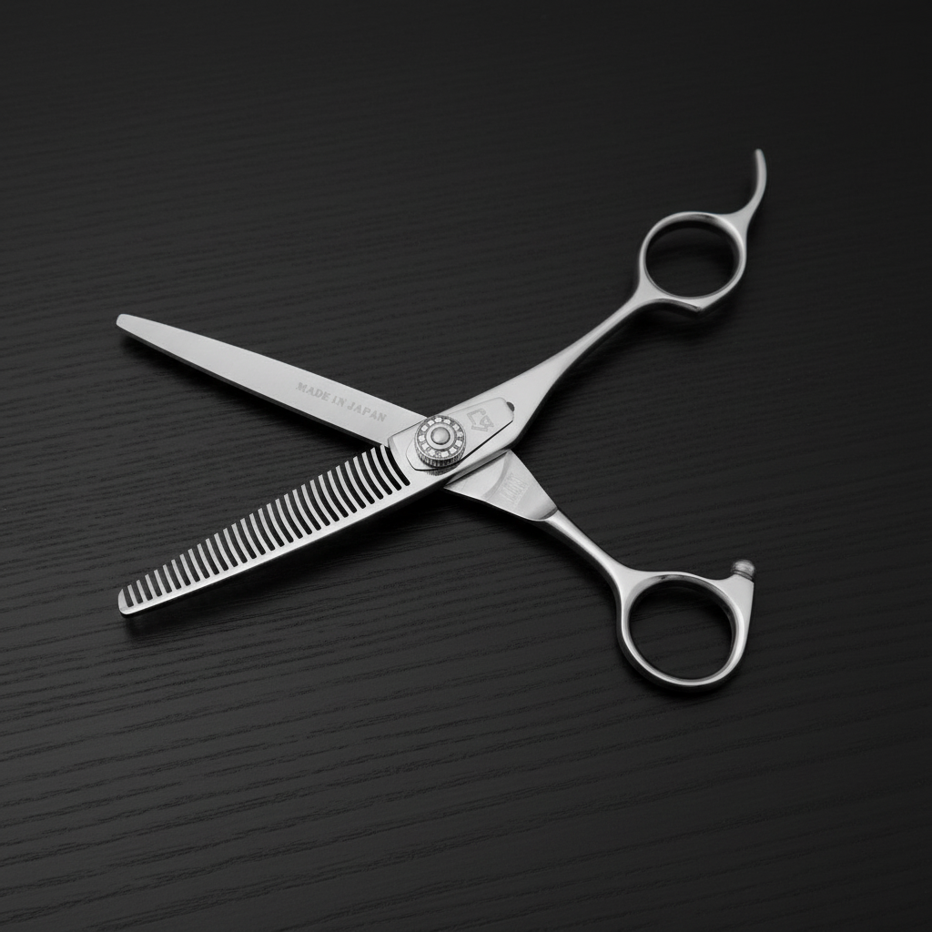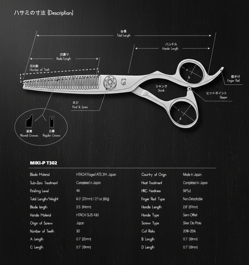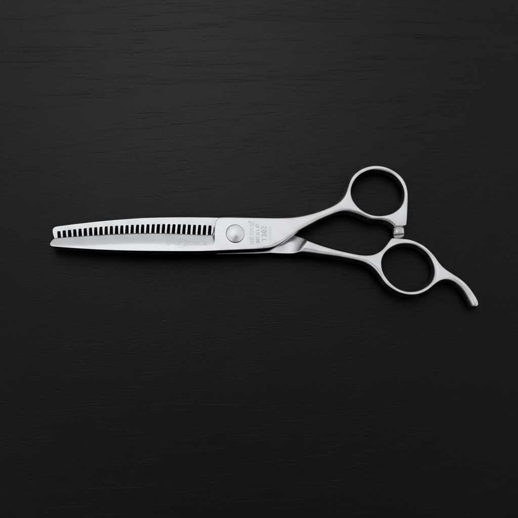 The MIKI-P T302 is a 6-inch 30-teeth thinner that removes 20%~25% of hair, and two waved grooves on each tooth leave no cutting lines. . A big enough thumb ring comfortably fits an even bigger hand.