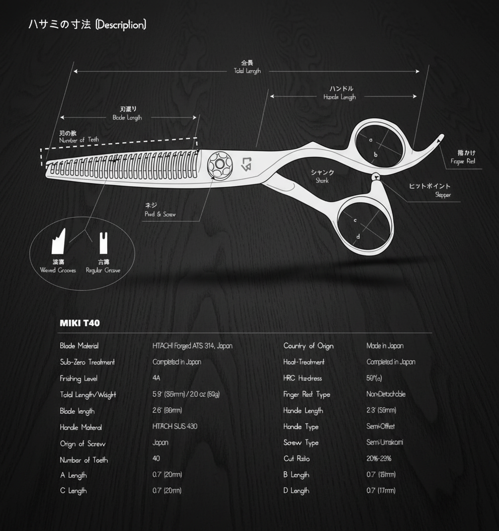 The MIKI T40 is a 6-inch 40 teeth thinner that removes 20%~25% of hair, and a V-shaped groove on each tooth helps easy hair removal. A big enough thumb ring comfortably fits an even bigger hand.