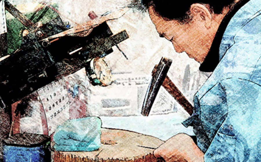 Experienced Japanese-trained sharpeners carefully refine the micro-bevel edges and ride line of the scissors using Japanese-made whetstones and 8-inch discs. Only expert craftsmen can reduce the edge thickness from 5 microns to less than 1 micron.