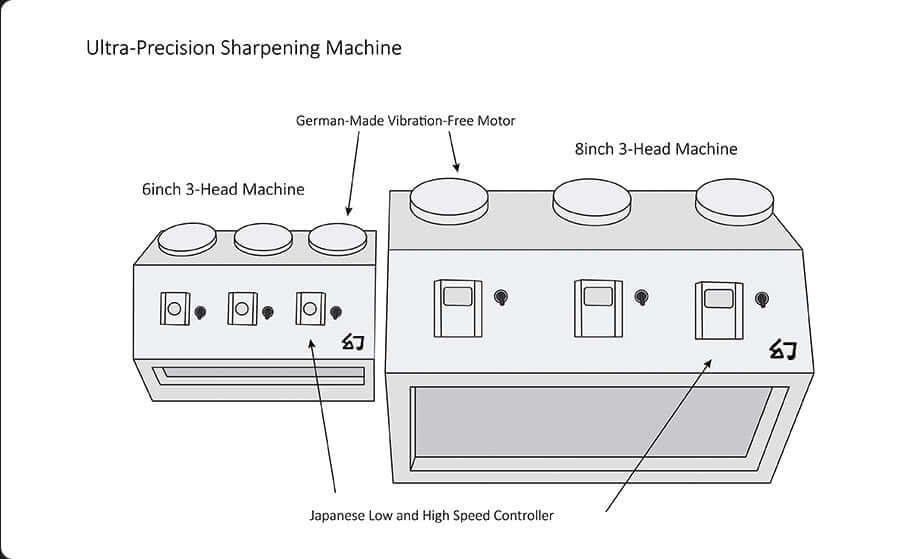 As part of our authentic Japanese scissors sharpening services, we use advanced technology with minimal honing to restore the sharpest edge. We are proud to have designed and developed the world's FIRST and ONLY 3-head sharpening machines, featuring 6" and 8" heads. Our cutting-edge Japanese sharpening technology is unmatched by any other company.