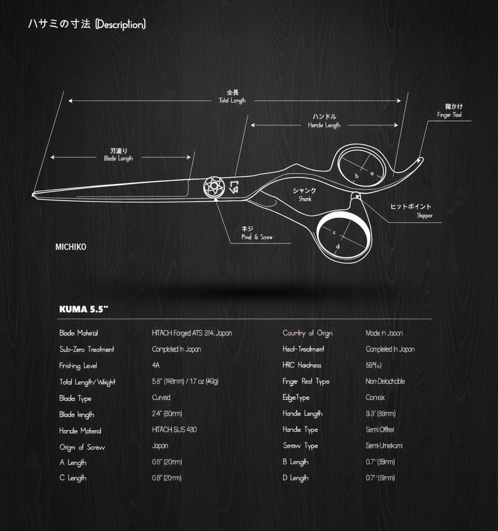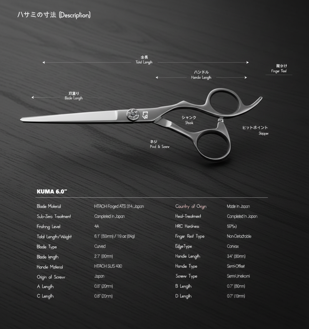 The KUMA is suitable for both blunt and slide cuts. Unlike straight-blade scissors, Its slightly curved edge facilitates slide cuts. KUMA works for both wet and dry hair.
